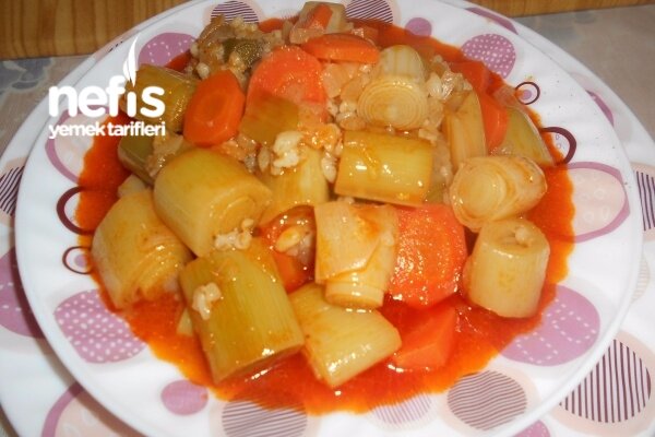 Please contact us if you want to publish a bulgurlu ve etli pırasa. 2 tane pırasa 1 çay bardağı pilavlık bulgur 1 kuru soğan 4 kaşık sıvı yağ 1 kaşık domates salçası yarım kaşık biber salçası 2 kaşık toz sumak 5 bardak sıcak su, 2 tane pırasa, 1 çay bardağı pilavlık bulgur, 1 kuru soğan, 4 kaşık sıvı yağ, 1 kaşık domates salçası, yarım kaşık biber salçası. Geniş orta boy bir tencere içine yarım çay bardağı zeytinyağ koyup, ısıtın. Üzerine doğradığınız havuçları ekleyip, 2 dakika soteleyin.