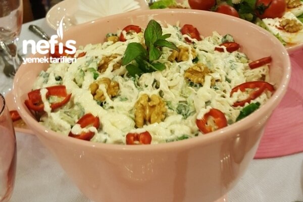 Pançolu Tavuk Salatası. Tavuk salatası tarifi yapım aşaması. 1 çorba kasesi dolusu haşlanıp küçük didilmiş tavuk göğsü (yarım kg kadar)1 çorba kasesi susuz yoğurt2 adet salatalık (veya kornişon turşu)1 büyük diş sarımsak1 çay bardağı kadar iri dövülmüş ceviz1 silme tatlı kaşığı tuz2 yemek k.